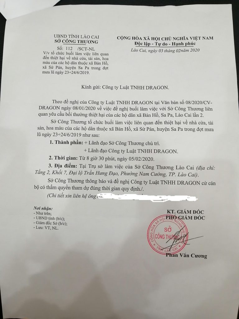 Lawyer Nguyen Minh Long - Director of Dragon Law Firm is a defender of the legal rights and interests of 18 households in Ban Ho commune, Sa Pa district, Lao Cai province. The lawyer contacted to work with the leaders of the Department of Industry and Trade of Lao Cai - a specialized management agency ....specializing in performing the consultancy function and helping the Provincial People's Committee perform the state management function of industry and trade, including energy management. Pursuant to Notice No. 112 / SCT-NL of the Department of Industry and Trade of Lao Cai Province, issued on February 3th, 2020 on holding sessions related to damage to houses, properties and crops of household in Ban Ho commune and Su Pan commune in Sa Pa district during the flood on June 23-24th, 2019.